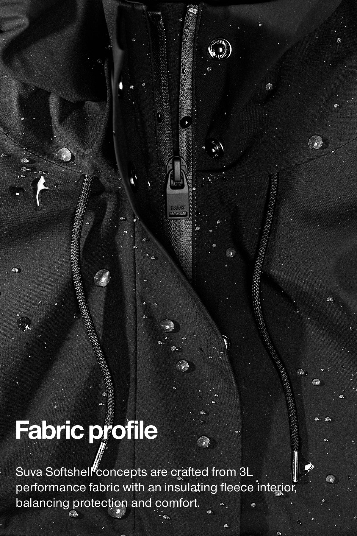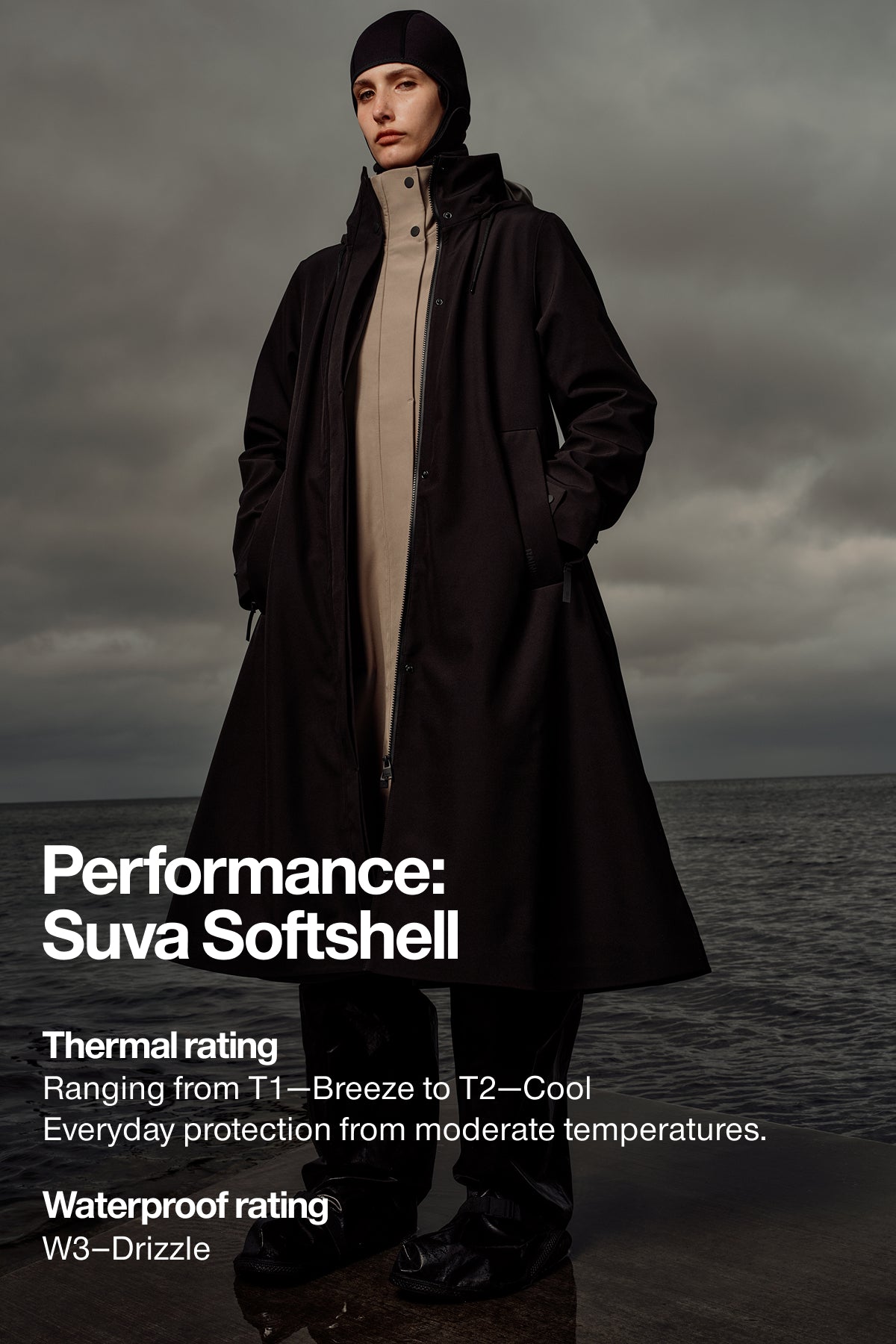 Technical utility redefined for the city. Suva Softshell concepts are crafted from 3L performance fabric with an insulating fleece interior, balancing protection and comfort. Elevated by contemporary cropped, oversized, and A-line silhouettes.